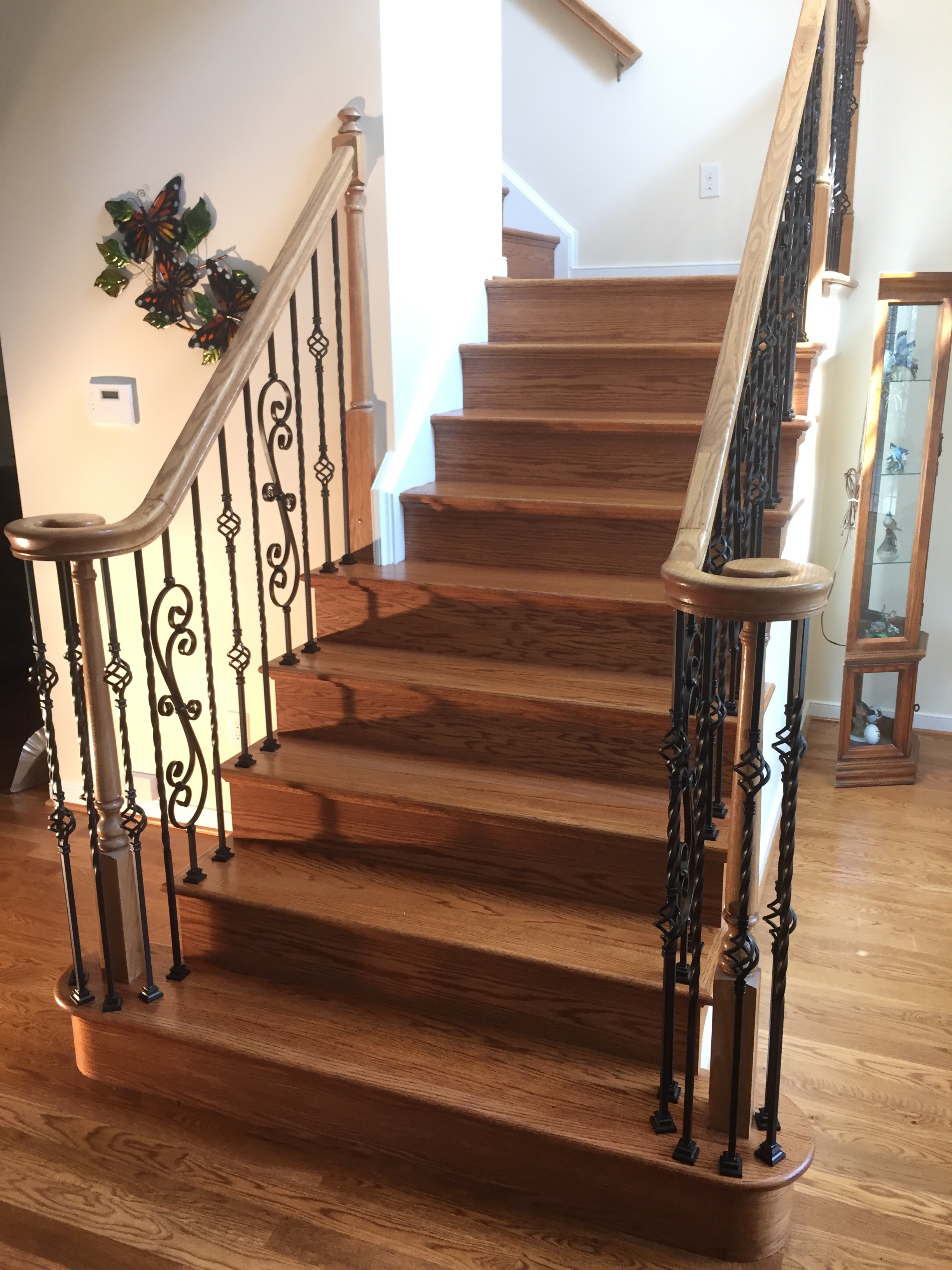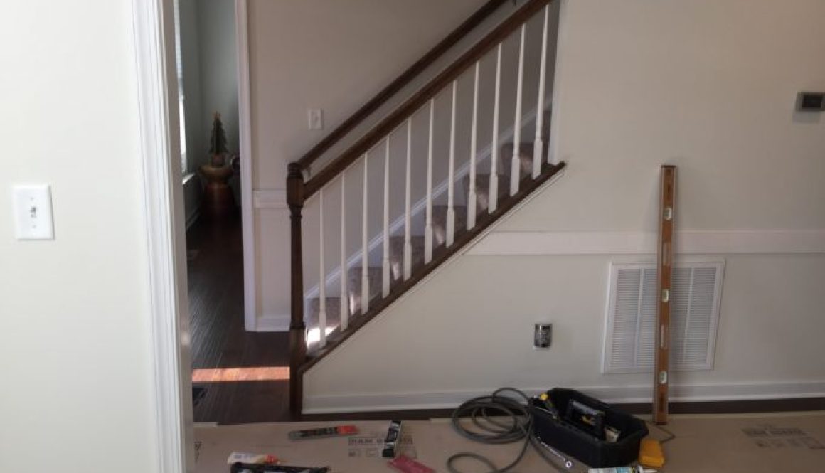 Pictured above: I have installed the wainscoting and the balusters. The job took two days. I didn’t cost a fortune! Call me today (804)591-9869 for a free no obligation estimate. I will ask you to email me pictures of the space. I will ask for your address with zip code so you can get an idea of the cost.