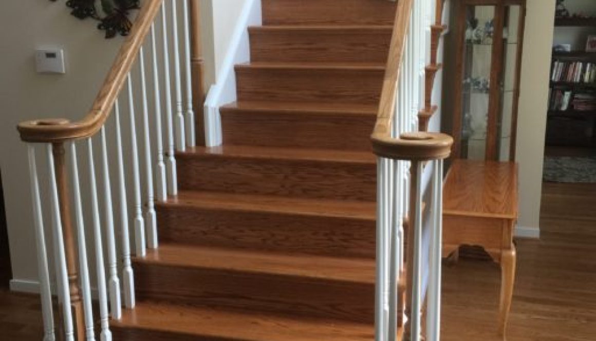 This week I took a trip to the White Oaks subdivision near Varina, Henrico, Virginia. I completely sanded down the Delaney family’s stair railing and applied a darker stain and clear coat. I also removed the white builder grade pickets and installed iron balusters. Twist and basket type balusters supplied by WM Coffman. Free estimates please email us